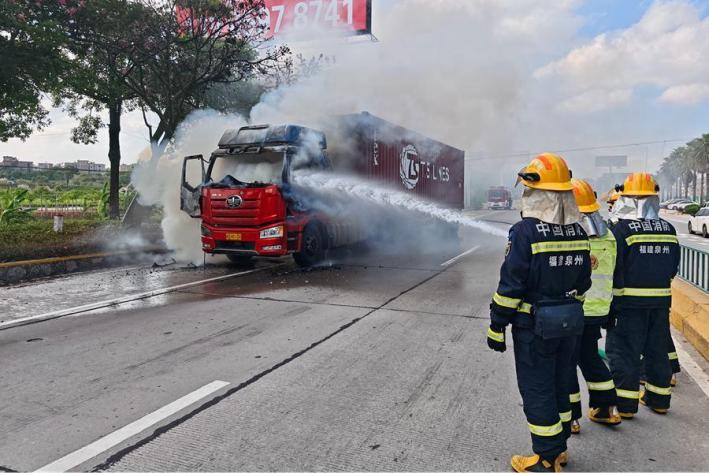 10月8日上午9時(shí)左右,在泉州惠安,一輛行駛中的貨車突然起火。