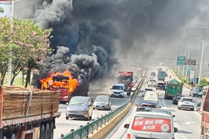據(jù)駕駛員稱,車輛行駛過程中,他突然聞到一股焦味,發(fā)現(xiàn)貨車中控位置下半部分突然起火,便立刻將車停在路邊并報(bào)警求助。目前,起火原因正在調(diào)查中。