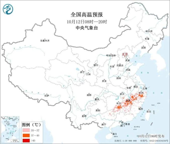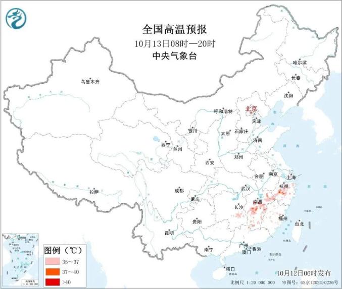 江南大部華南北部仍有高溫天氣。12日至13日,江西、浙江、福建、廣東北部、廣西北部、湖南東部和南部等地有35℃以上高溫天氣。其中,江西、浙江中西部等地部分地區(qū)最高氣溫可達(dá)38℃以上。