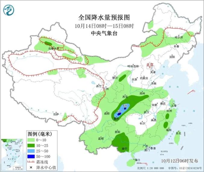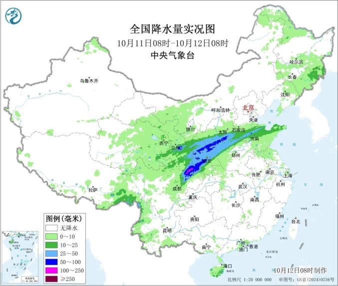 其中,10月12日08時(shí)至13日08時(shí),陜西南部、四川東北部、重慶大部、湖北西部、山西南部、河南西部、山東西北部等地部分地區(qū)有大到暴雨,重慶北部等地局地有大暴雨(100至120毫米)。上述部分地區(qū)伴有短時(shí)強(qiáng)降水(最大小時(shí)降雨量20至30毫米,局地可超過(guò)50毫米),局地有雷暴大風(fēng)等強(qiáng)對(duì)流天氣。中央氣象臺(tái)10月12日06時(shí)繼續(xù)發(fā)布暴雨藍(lán)色預(yù)警。