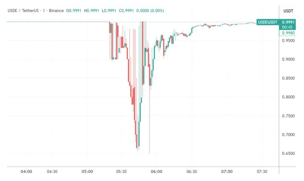 從周六早上5時20分左右起,USDe在某知名交易所的現(xiàn)貨價格突然脫錨,半小時內(nèi)最低跌至0.65美元。這場風(fēng)波持續(xù)了近兩小時,期間多種主流貨幣的封裝代幣同步暴跌,共同造成了幣圈歷史級別的大爆倉。