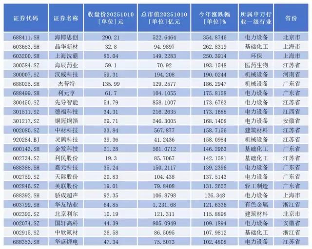 其中,23家上市公司股價成功實現(xiàn)翻倍,海博思創(chuàng)(688411.SH)、晶華新材(603683.SH)、上海洗霸(603200.SH)位居前三,年內(nèi)股價漲幅均超過200%。