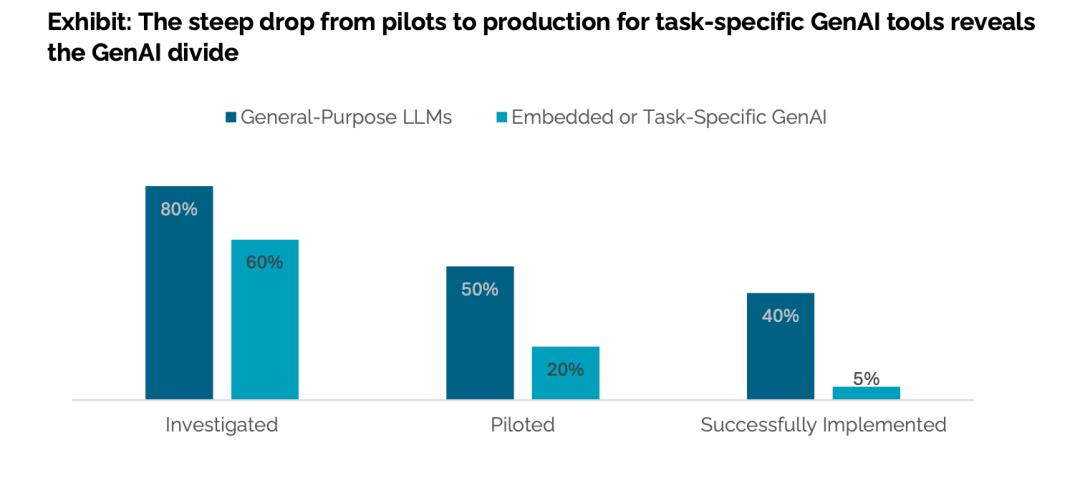 其次在“通用”與“專用”的選擇上,MIT的數(shù)據(jù)同樣反直覺。報告顯示,在調研初期,有60%的企業(yè)考慮采用特定任務型GenAI。然而,從試點到成功實施,這個比例驟降至僅剩5%。與之相比,通用大語言模型的表現(xiàn)則穩(wěn)健得多。