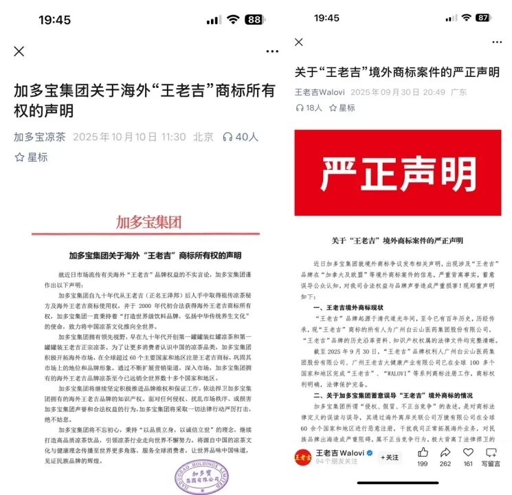 10月10日,加多寶在自己的公眾號上發(fā)布了關(guān)于海外“王老吉“商標(biāo)的所有權(quán)聲明,這是短短一旬時間里,加多寶第二次發(fā)公眾號,以維護(hù)自己對于“王老吉”海外所有權(quán)正統(tǒng)地位的維護(hù)。