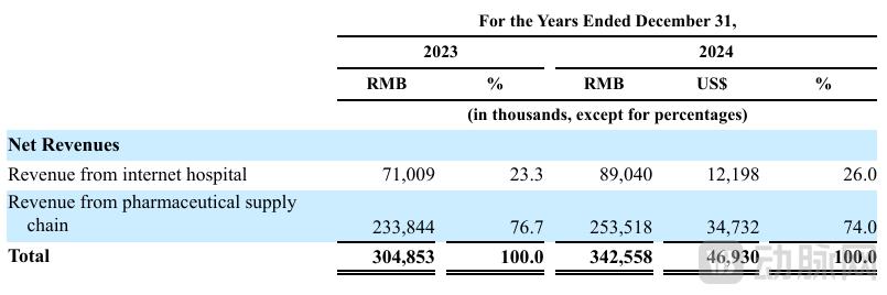 2023年、2024年,石榴云醫(yī)分別實現(xiàn)了約3.05億元(如無特殊說明,全文均指人民幣)、3.43億元的收入,以及產(chǎn)生3690萬元、3740萬元的虧損。公司收入主要來自互聯(lián)網(wǎng)醫(yī)院和醫(yī)藥供應(yīng)鏈兩大業(yè)務(wù)板塊,其中互聯(lián)網(wǎng)醫(yī)院收入占比小,但盈利能力更強;醫(yī)藥供應(yīng)鏈收入占比高,但毛利率較低,這與以往電商屬性的平臺狀況相似。