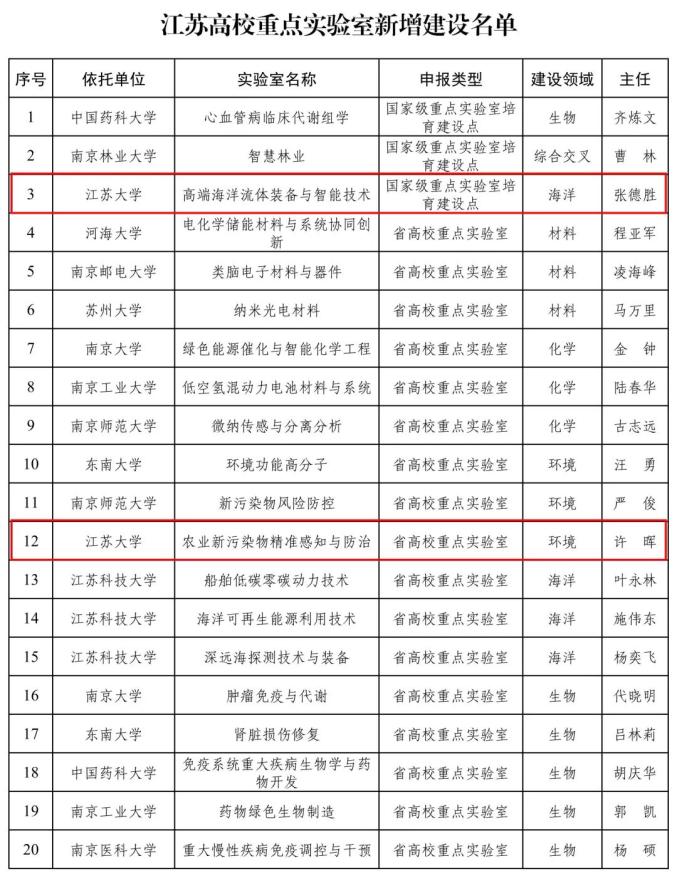 近日,江蘇省教育廳發(fā)布《江蘇高校重點(diǎn)實(shí)驗(yàn)室新增建設(shè)名單》(蘇教科函〔2025〕21號(hào)),江蘇大學(xué)傳來(lái)喜訊。由我校流體中心張德勝教授牽頭申報(bào)的“高端海洋流體裝備與智能技術(shù)實(shí)驗(yàn)室”入選國(guó)家級(jí)重點(diǎn)實(shí)驗(yàn)室培育建設(shè)點(diǎn)(本批次全省共3家),這將成為我校服務(wù)國(guó)家海洋強(qiáng)國(guó)戰(zhàn)略的重要科研平臺(tái);環(huán)安學(xué)院許暉教授牽頭申報(bào)的“農(nóng)業(yè)新污染物精準(zhǔn)感知與防治實(shí)驗(yàn)室”獲批省高校重點(diǎn)實(shí)驗(yàn)室。