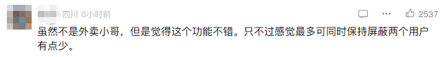 該功能引發(fā)網(wǎng)友熱議,不少網(wǎng)友表示“就應(yīng)該這樣,外賣員也有選擇權(quán)”,還有網(wǎng)友稱“最多只能屏蔽兩個(gè)太少了”。
