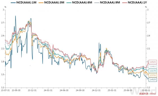 全國(guó)和主要股份制銀行一年期同業(yè)存單最新成交在1.65%附近,較上日略有下降。
