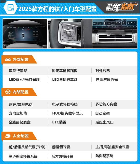 2025款方程豹鈦7的入門車型是135KM兩驅(qū)Pro版。雖為入門車型,但配置表現(xiàn)不錯(cuò),像對(duì)外放電、自適應(yīng)遠(yuǎn)近光、自動(dòng)空調(diào)、后座出風(fēng)口、多功能方向盤等常用配置都有配備。同時(shí),它的安全配置也較為齊全,配備了前/后排頭部氣囊(氣簾)、前排側(cè)氣囊、防側(cè)翻系統(tǒng)和車道偏離預(yù)警系統(tǒng)等。不過(guò),不推薦這款車的主要原因是其在CLTC純電續(xù)航里程和駕駛操控配備方面還有提升空間。