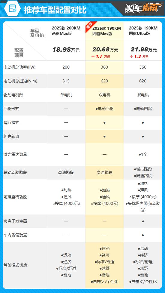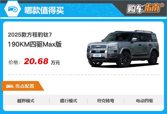 綜合來(lái)看,如果您正在關(guān)注2025款方程豹鈦7,那么190KM四驅(qū)Max版值得優(yōu)先考慮。