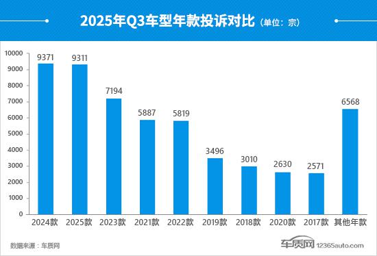 2025款車型投訴量持續(xù)上升,環(huán)比漲25.6%,接近2024款車型,故障集中在“轉(zhuǎn)向系統(tǒng)異響”和“下擺臂故障”。2021款車型投訴量漲幅大,較二季度漲47.9%,排名升至第四。