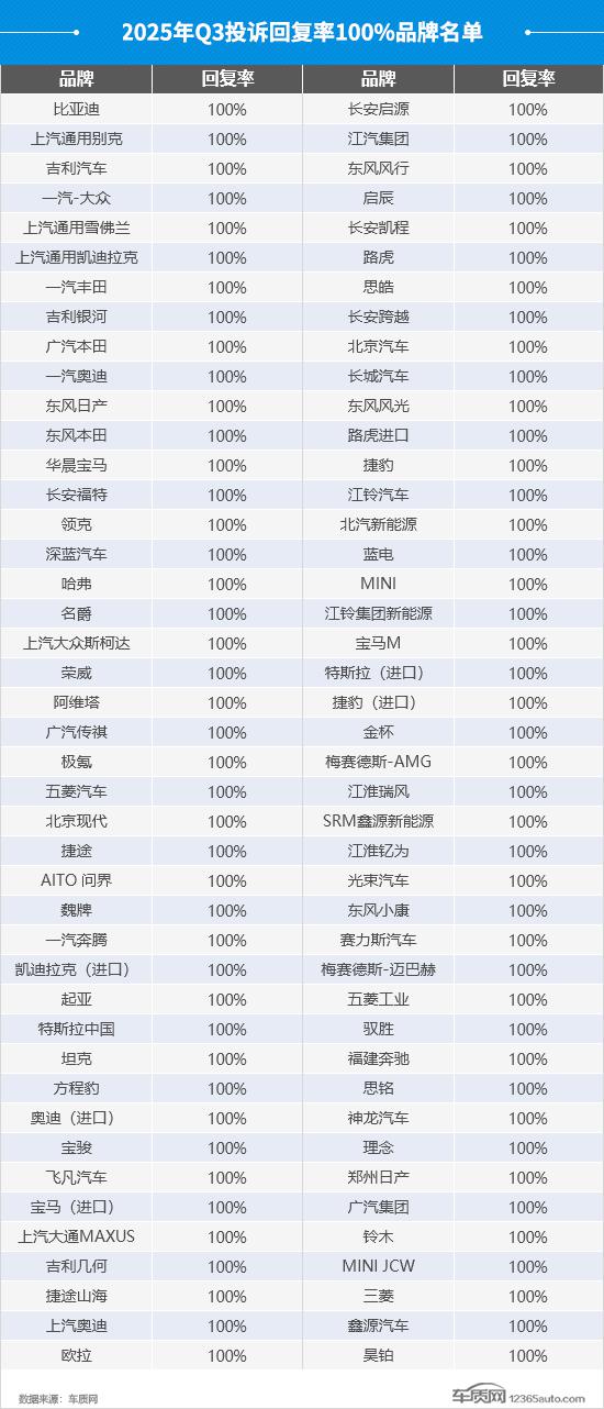 三季度,86家品牌投訴回復(fù)率達100%,比上季度多5家,值得肯定。零跑汽車、一汽紅旗和沃爾沃等品牌回復(fù)率不足50%,需加強對車主訴求的重視。