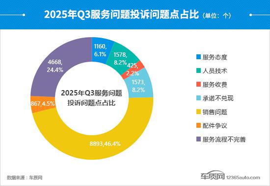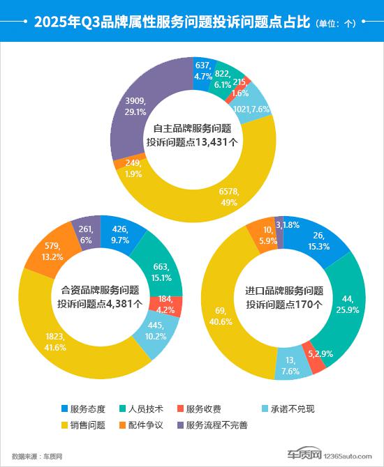 三季度,自主品牌投訴問題點漲幅領(lǐng)先,環(huán)比漲29.1%,服務(wù)流程不完善占比增11.4個百分點,超總量1/4,“系統(tǒng)升級問題”是主因。合資品牌除銷售問題外,配件爭議占比升至兩位數(shù),較上季度提高4.2個百分點。進口品牌服務(wù)問題增長點在人員技術(shù),集中在“修出新問題”。