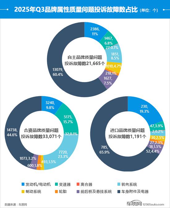三季度,自主、合資和進口品牌質(zhì)量問題投訴故障數(shù)均增,合資品牌環(huán)比漲幅領(lǐng)先,較二季度漲42.1%。自主品牌和合資品牌增長點在轉(zhuǎn)向系統(tǒng),合資品牌占比提高9.1個百分點,超總量1/5。進口品牌發(fā)動機/電動機占比提升,投訴故障數(shù)環(huán)比漲47.4%,集中在部分林肯進口車型。