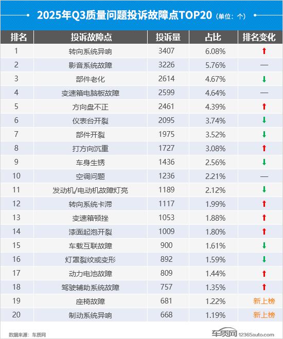 三季度新上榜故障點減少2個且排名靠后?!稗D(zhuǎn)向系統(tǒng)異響”升至首位,投訴故障數(shù)環(huán)比超1.5倍。TOP20榜單中,轉(zhuǎn)向系統(tǒng)故障排名和投訴數(shù)提升,理想汽車四款主銷車型是主因。“座椅故障”首次上榜,投訴故障數(shù)環(huán)比漲37.9%。