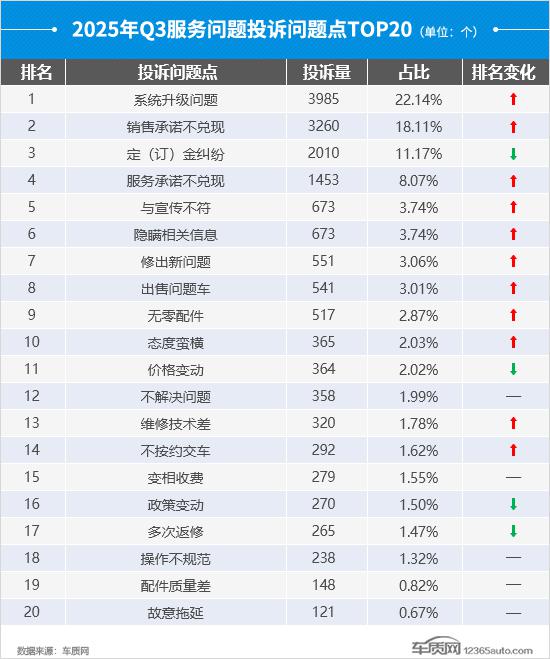 TOP20投訴問題點榜單中,多數(shù)問題排名上升,“系統(tǒng)升級問題”和“銷售承諾不兌現(xiàn)”投訴超3000個,環(huán)比翻倍?!盁o零配件”升至前10,投訴問題數(shù)環(huán)比漲87.3%。