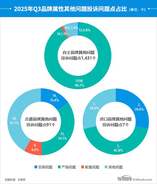 合資品牌其他問題占比明顯提升,超產(chǎn)品問題,環(huán)比提高19.2個百分點。進口品牌投訴問題點回升,召回、產(chǎn)品和其他問題呈“三足鼎立”。