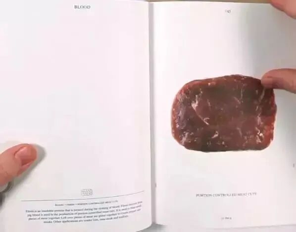 這也許是書(shū)中最無(wú)趣的部分?不一定??纯聪旅孢@塊牛肉,它雖是牛肉,但05049號(hào)豬也為其生產(chǎn)出了力。這種“控量切割肉”是把零碎牛肉“粘起來(lái)”再切片的產(chǎn)物。怎么粘呢?其中一種方法要用到從豬血中提取的纖維蛋白。