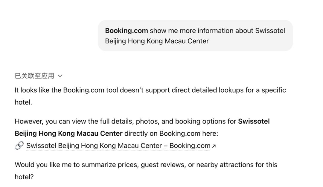 當(dāng)進(jìn)一步要求介紹酒店詳細(xì)信息時(shí),ChatGPT顯示不支持查看App內(nèi)酒店詳細(xì)信息,只能以文字形式呈現(xiàn)。這意味著Booking在ChatGPT內(nèi)的嵌入目前只是網(wǎng)頁搜索結(jié)果,與列表方式無本質(zhì)區(qū)別。