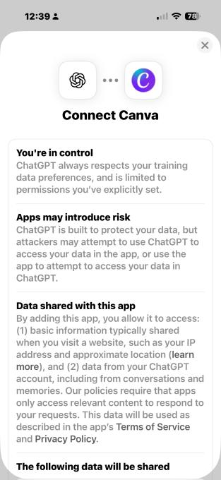 反觀ChatGPT,用戶使用其應(yīng)用功能前,需先安裝對(duì)應(yīng)應(yīng)用,再通過充滿警告的權(quán)限屏幕將其連接到ChatGPT,還要經(jīng)過多步驗(yàn)證完成綁定,過程并不輕松。