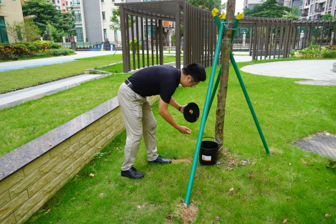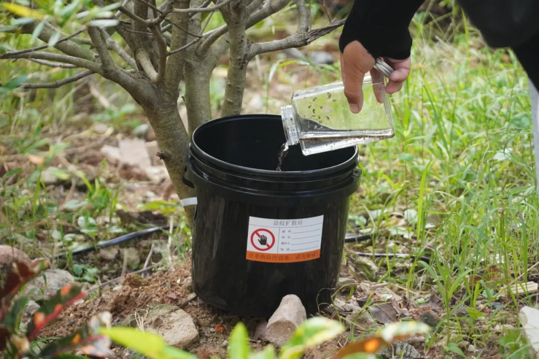 10月9日下午,記者在長(zhǎng)沙街道中富花園看到,小區(qū)綠化帶等公共區(qū)域布置了多個(gè)黑色桶狀的“益蚊擴(kuò)散站”,專業(yè)人員正將攜帶沃爾巴克菌的絕育雄蚊蛹投放進(jìn)去。這些雄蚊蛹羽化成蚊后,會(huì)與野外雌蚊交配,讓雌蚊“斷子絕孫”,成為阻擊登革熱、基孔肯雅熱等蚊媒傳染病的“生物尖兵”。