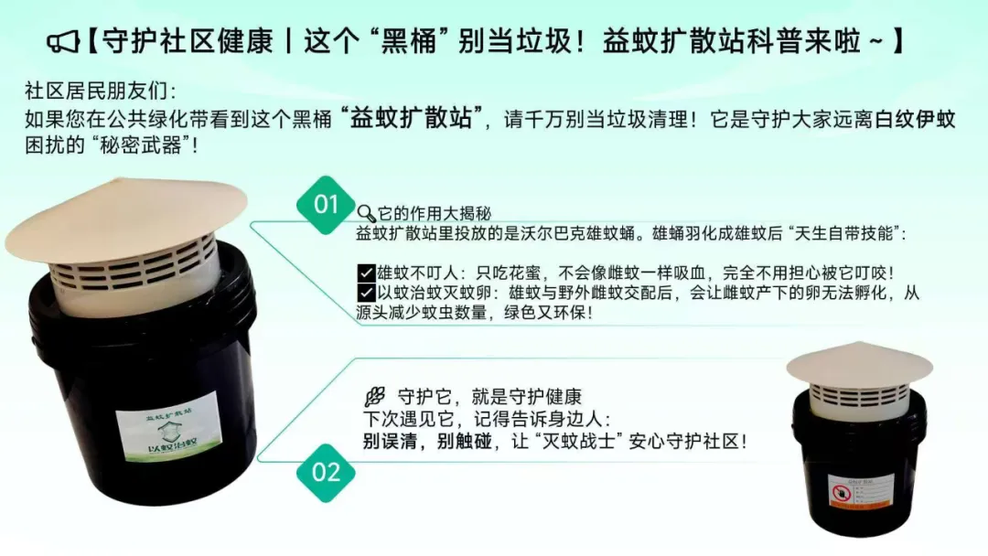 與普通蚊子不同,攜帶沃爾巴克菌的絕育雄蚊不叮人、不吸血,以植物汁液和花蜜為食,不會(huì)對(duì)人畜造成侵?jǐn)_,還能讓野外雌蚊絕育,因此被稱為“益蚊”。“益蚊擴(kuò)散站”就像是絕育雄蚊蛹的“家”,雖然里面有積水條件,但預(yù)先投放了保幼激素,使野外雌蚊產(chǎn)下的卵無(wú)法發(fā)育成蚊,避免擴(kuò)散站成為新的陽(yáng)性孳生地。