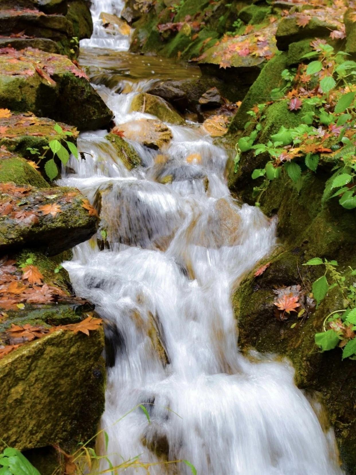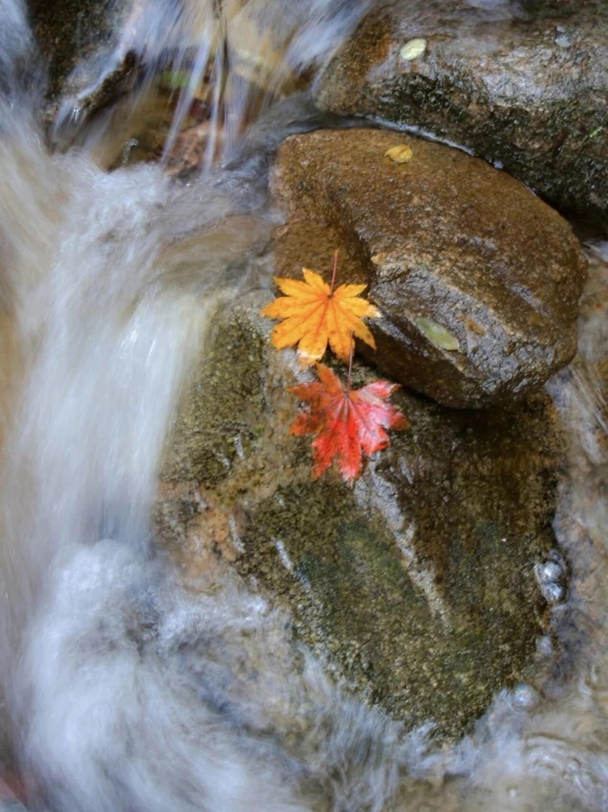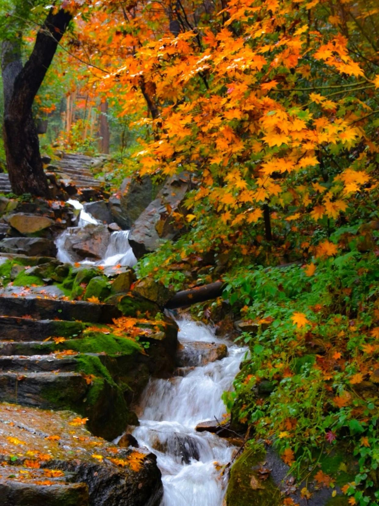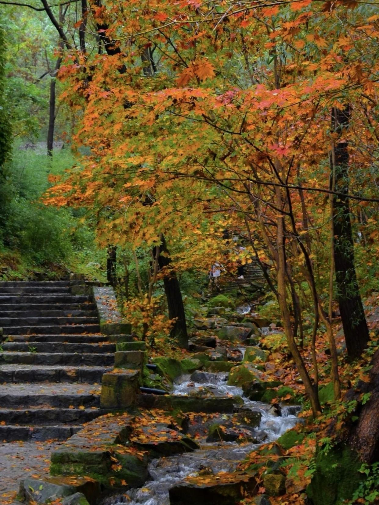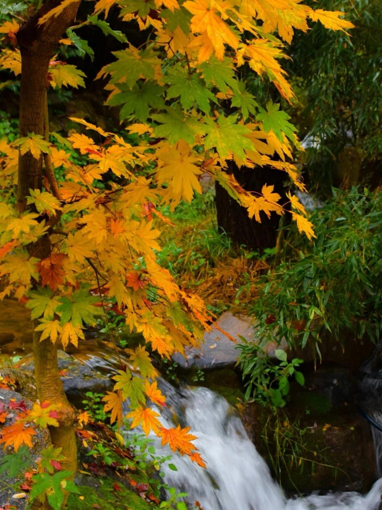 沿著木棧道緩緩向上走,每一步都好像踩碎了一地的斑斕色彩,溪水裹挾著落葉奔流,濺起的水珠里仿佛都藏著秋天的悄悄話。