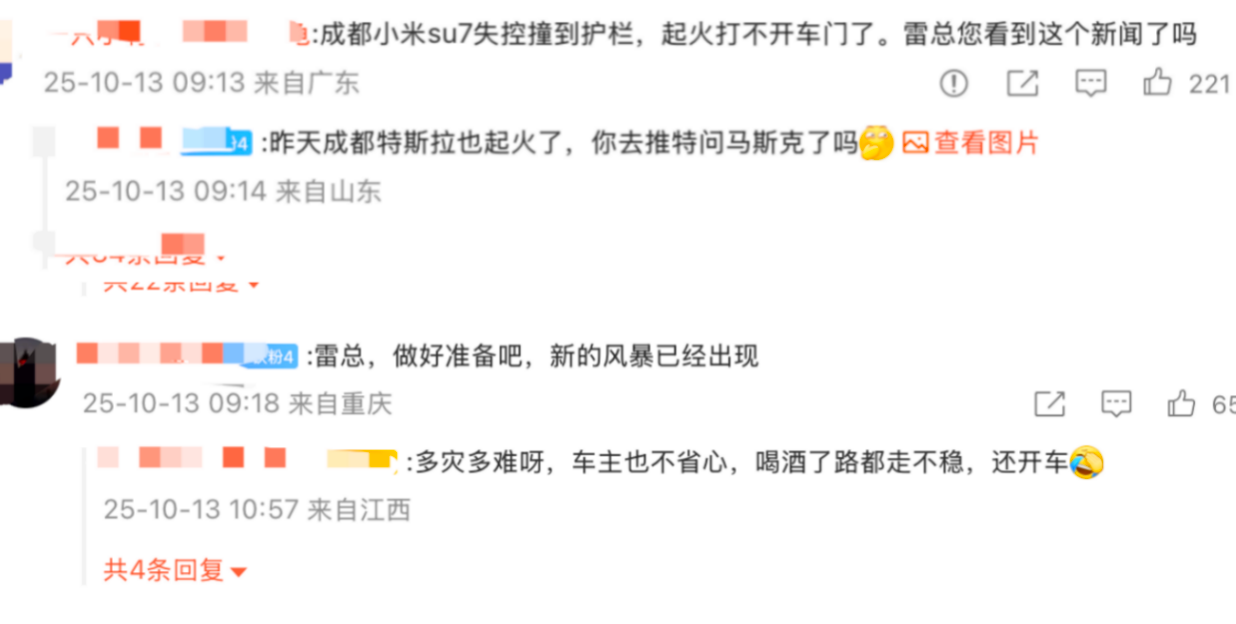 有網友到雷軍微博留言:“成都小米SU7失控撞到護欄,起火打不開車門了”“做好準備吧,新的風暴已經出現”。
