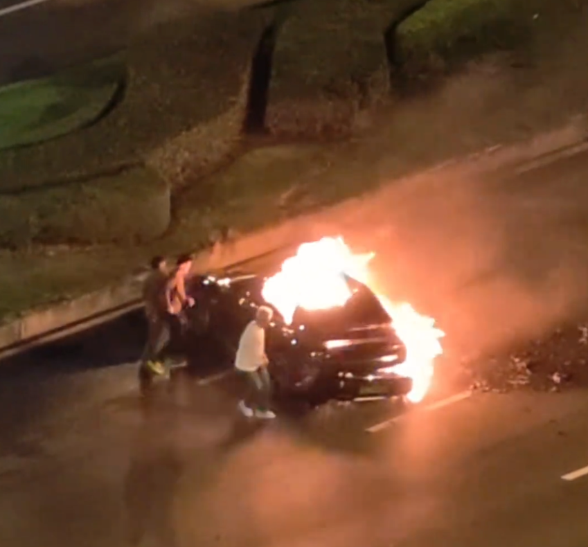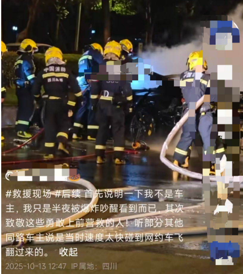 從流傳出的視頻能看到,多名路人努力救援,但始終打不開車門,只能看著火焰吞噬車身。有目擊者稱半夜被爆炸聲吵醒,部分同路車主說涉事車輛當時車速太快,碰到網約車后飛翻了過來。