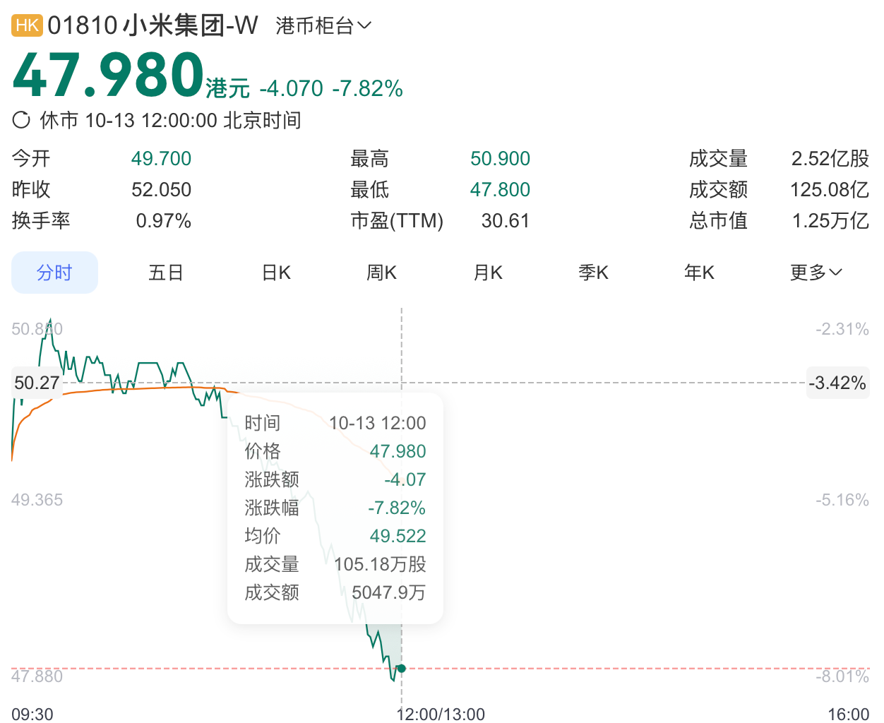 小米SU7的安全問題備受關注。官方沉默,與資本市場反應鮮明對比。截至10月13日午盤,小米集團(01810.HK)股價跌7.82%,報47.98港元/股。