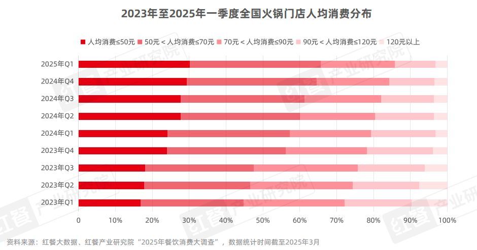 價格帶的結構性變化更為明顯。紅餐產(chǎn)業(yè)研究院發(fā)布的報告指出,2023年至2025年一季度,人均消費90元以上的門店占比大幅減少16.9個百分點;相反,70元及以下的“性價比”門店逆勢擴張,占比提升20.9個百分點。