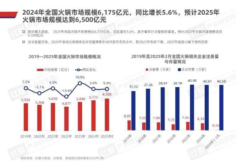 紅餐大數(shù)據(jù)顯示,2024年全國火鍋市場規(guī)模為6175億元,雖然同比增長5.6%,增速高于餐飲大盤,但比2023年明顯下滑。