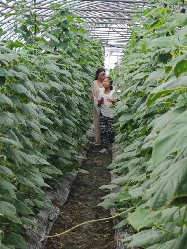 生態(tài)園的蔬菜大棚里,黃瓜、玉米、芋艿長勢良好。孩子們在菜田里穿梭,享受采摘樂趣。從市區(qū)趕來的吳女士一家,帶孩子體驗農(nóng)事、親近自然,“想讓孩子在勞作中理解課本知識,走進大自然”。