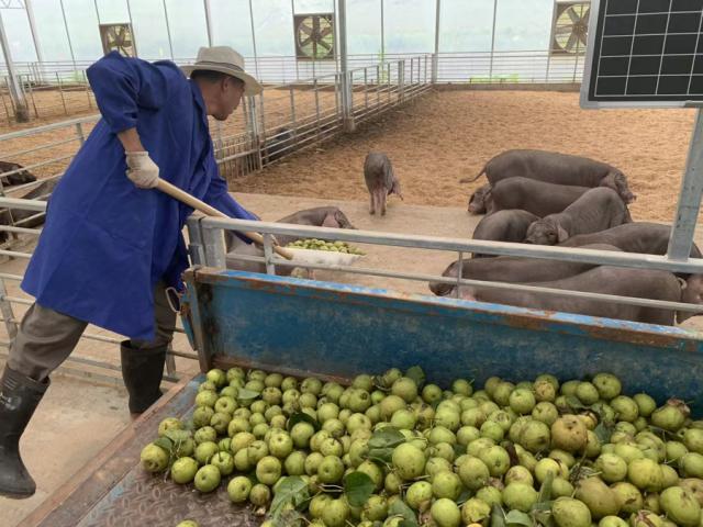 農(nóng)場的主角是嘉定梅山豬。它們在生態(tài)園里從30公斤長到100公斤,居住環(huán)境舒適,吃園內(nèi)應(yīng)季蔬果的殘果、落地果??蒲腥藛T和養(yǎng)殖專家還為它們打造了“無臭”發(fā)酵床。
