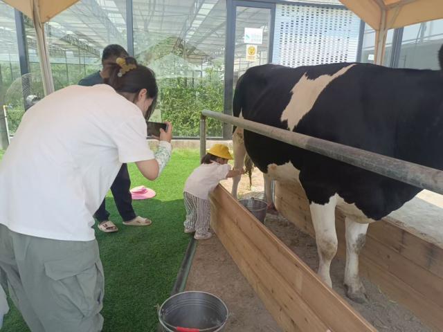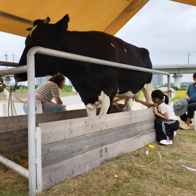 擠牛奶活動很受歡迎。孩子們在工作人員指導(dǎo)下學(xué)習(xí)擠奶,看似簡單,實則要控制力道、安撫奶牛情緒。大家都感嘆:“喝到一杯牛奶真不容易!”