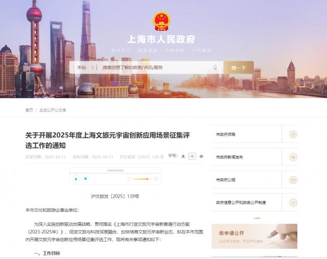 10月11日,上海市文旅局發(fā)布了關(guān)于開展2025年度上海文旅元宇宙創(chuàng)新應用場景征集評選工作的通知,截止時間為11月7日。