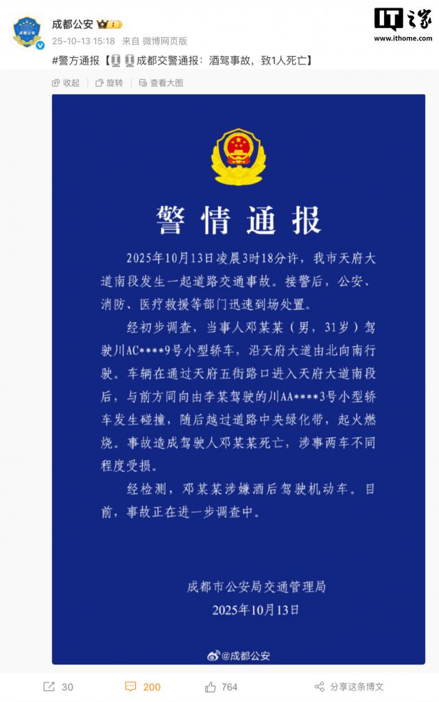 IT之家10月13日消息,成都市公安局交通管理局于10月13日15時(shí)18分發(fā)布通報(bào),2025年10月13日凌晨3時(shí)18分許,天府大道南段發(fā)生一起道路交通事故。接警后,公安、消防、醫(yī)療救援等部門(mén)迅速到場(chǎng)處置。