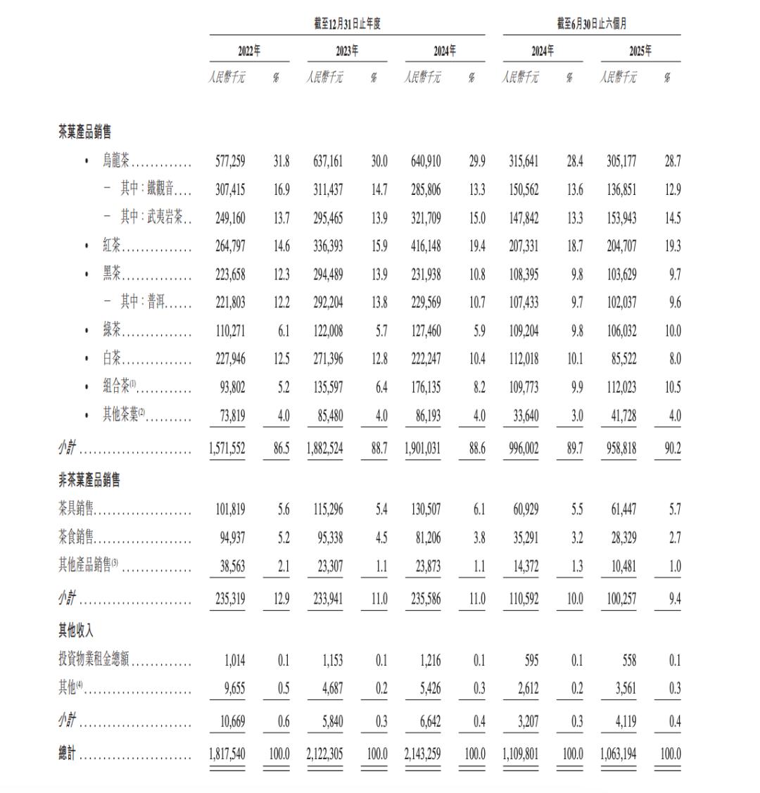 茶葉產(chǎn)品是八馬茶業(yè)的核心增長(zhǎng)引擎。其產(chǎn)品組合包括茶葉、茶具及茶食,茶葉銷(xiāo)售是主要收入來(lái)源,2022 - 2025年上半年,茶葉產(chǎn)品銷(xiāo)售營(yíng)收占比分別為86.5%、88.7%、88.6%、90.2%。
