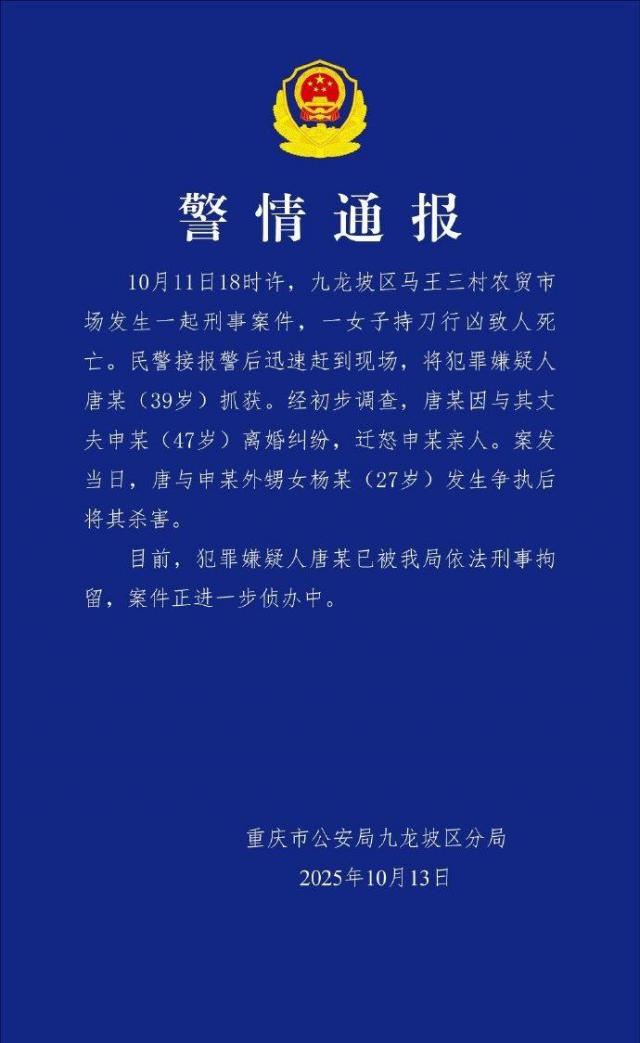 10月11日18時(shí)左右,九龍坡區(qū)馬王三村農(nóng)貿(mào)市場發(fā)生一起刑事案件,一名女子持刀行兇致人死亡。民警接到報(bào)警后迅速趕到現(xiàn)場,將犯罪嫌疑人唐某(39歲)抓獲。經(jīng)初步調(diào)查,唐某因與其丈夫申某(47歲)的離婚糾紛,遷怒于申某的親人。案發(fā)當(dāng)日,唐某與申某外甥女楊某(27歲)發(fā)生爭執(zhí)后將其殺害。