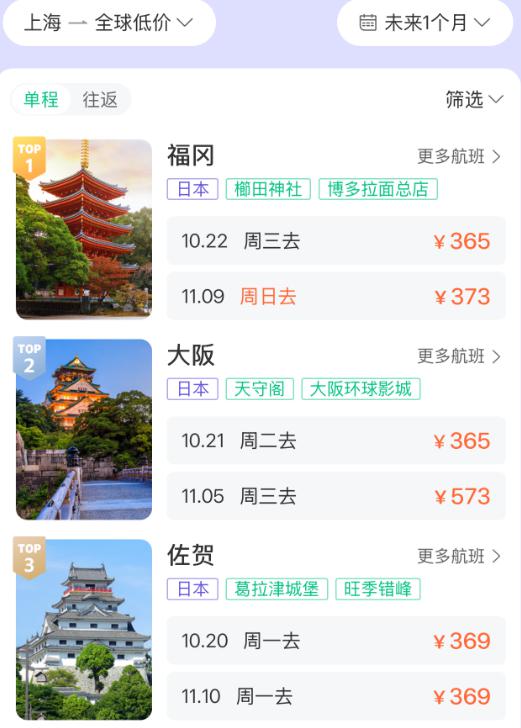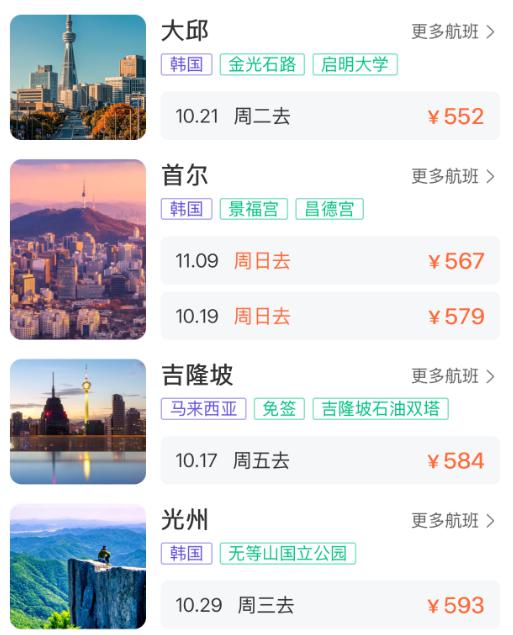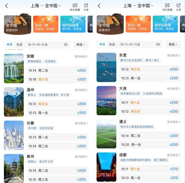 此外,十月中下旬,泉州、大連、遵義、成都等熱門旅游城市,從上海出發(fā)的機(jī)票價(jià)格最低甚至都在200元左右。