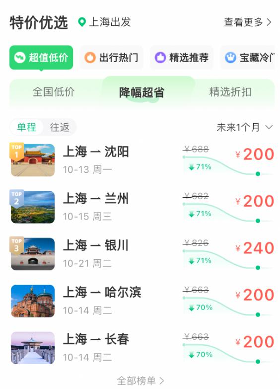 另據(jù)同程旅行平臺數(shù)據(jù)顯示,10月中下旬至11月上旬,上海飛往沈陽、蘭州、銀川、哈爾濱、長春等熱門旅游目的地的機(jī)票,票價(jià)降幅都在70%左右(機(jī)票價(jià)格實(shí)時(shí)浮動、具體以APP實(shí)際價(jià)格為準(zhǔn))。