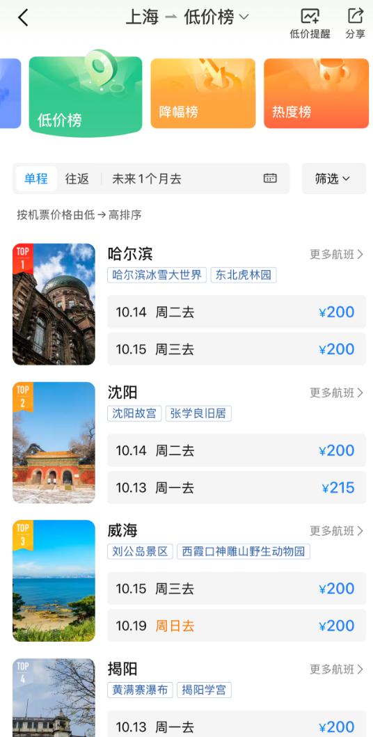 從上海去哈爾濱、沈陽、威海、揭陽等地,機(jī)票價(jià)格最低只要200元。