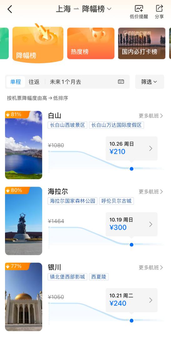 記者查詢發(fā)現(xiàn),據(jù)攜程旅行平臺數(shù)據(jù)顯示,未來1個(gè)月內(nèi),從上海出發(fā)至白山、海拉爾,機(jī)票價(jià)格降幅高達(dá)80%;至銀川、遵義、石河子、廈門等地,降幅均超過70%。