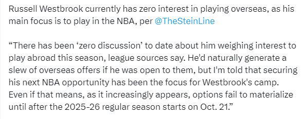 Marc Stein報(bào)道稱,消息人士透露,威少本賽季并未考慮去海外打球。若他有意,定會(huì)收到大量海外合同報(bào)價(jià)。但據(jù)悉,確保獲得下一個(gè)NBA機(jī)會(huì)一直是威少團(tuán)隊(duì)的重點(diǎn),即便這意味著(情況似乎愈發(fā)明顯)在10月21日常規(guī)賽開始前或許都無法達(dá)成。