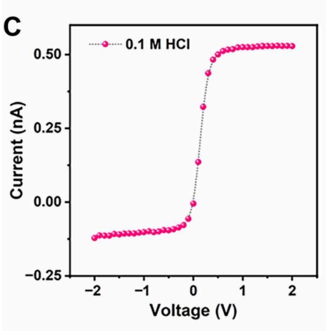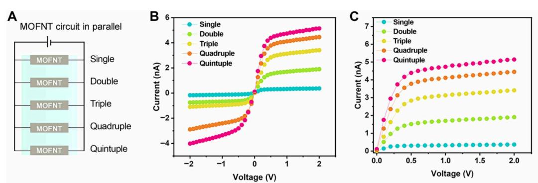 研究人員將制備好的MOF納流體晶體管浸入含不同離子的溶液中,測量電流 - 電壓特性。實驗發(fā)現(xiàn),使用鹽酸(HCl)溶液時,芯片電流隨電壓變化呈強烈非線性。低電壓下電流迅速上升,中等電壓上升趨緩,電壓超過約0.9V時電流增長飽和。
