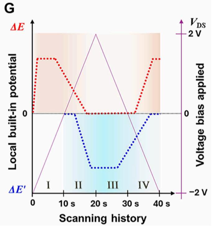這種特性類似電子學中三極管或場效應(yīng)管,只有質(zhì)子觸發(fā)了特殊的非線性開關(guān)。奧秘在于MOF晶體內(nèi)部的孔道和界面產(chǎn)生的「內(nèi)建電勢」阻擋質(zhì)子,外加電壓超過閾值時,質(zhì)子才能成群通過,且會使電流趨于飽和。