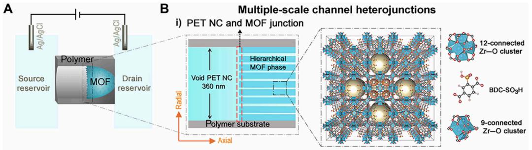 研究人員選用含鋯(Zr)金屬簇和對苯二甲酸衍生物的MOF材料,將氨基修飾的納米孔道膜夾在兩個溶液池之間,讓兩種溶液分子在孔道中結(jié)合生長MOF晶體。晶體內(nèi)部自發(fā)形成多個分界面,包括聚合物孔道與MOF晶體間的一維異質(zhì)結(jié)界面,以及MOF晶體內(nèi)部的微小界面和次級孔道,這些層級孔道和界面是芯片與眾不同的秘密。