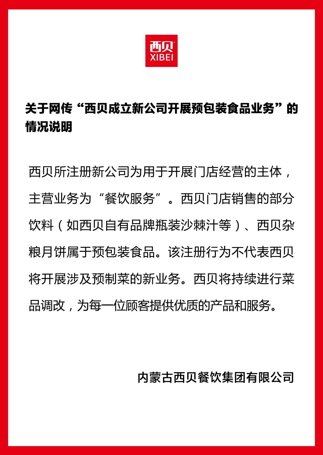 西貝在聲明中表示,新注冊公司是用于開展門店經(jīng)營的主體,主營業(yè)務(wù)為“餐飲服務(wù)”。西貝門店銷售的部分飲料(如自有品牌瓶裝沙棘汁等)、雜糧月餅屬于預(yù)包裝食品,但這并不代表西貝將開展預(yù)制菜新業(yè)務(wù)。