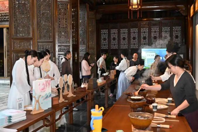△龍仰書院景區(qū)推出漢服舞蹈、古典樂器演奏、戲曲表演等免費文藝展演,并設有古法口脂制作、傳統(tǒng)繅絲、香牌制作等體驗項目