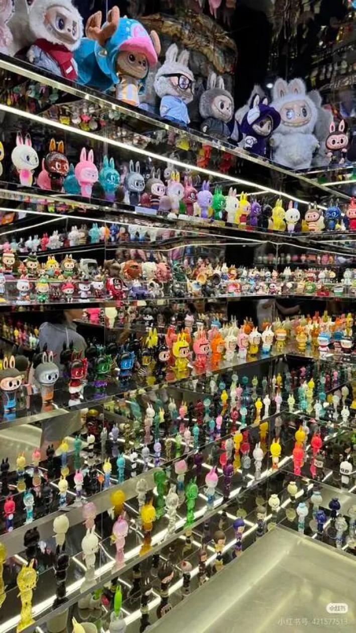 “鏡屋” 陳列了自2015年至今的THE MONSTERS公仔,鏡面的多重反射構(gòu)筑出虛實(shí)交織的視覺(jué)幻境,進(jìn)一步展現(xiàn)無(wú)限延伸的藝術(shù)宇宙。據(jù)說(shuō)單單LABUBU就有一千多只,堪稱“史上最全”。
